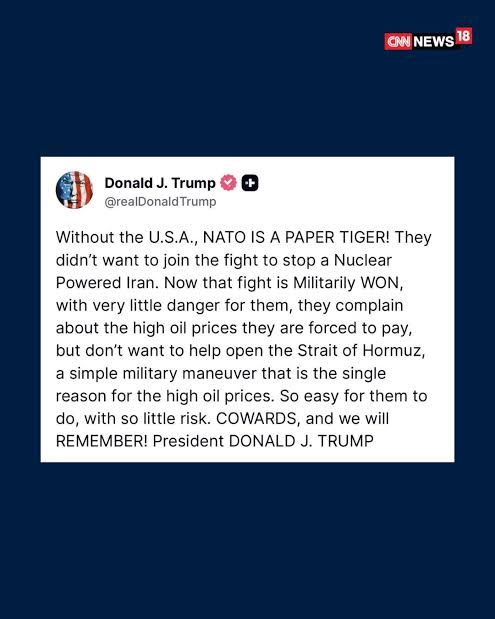 According to USA President Donald Trump, the countries of NATO are cowards because they don’t wish to open the Straight of Hormuz to shipping.